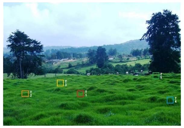 Afterward, 25 plots of 1 m2 dominated by kikuyu grass were selected. For this purpose, a scale was used according to forage yield from 1 to 5, with 5 being those sites with the highest production and 1 being those with the least forage biomass. These plots were used to establish five treatments (T1: low; T2: medium-low; T3: medium; T4: medium-high; T5: high) (Figure 2). At each site, a set of physical and chemical variables was evaluated and their relationship with DM production was quantified. Each variable was measured at the Soil Laboratory of Universidad Nacional de Colombia, Medellin Headquarters, except for penetration resistance and forage production. The first was measured in the field at a depth of 10 cm, and the second was cut one day before the animals entered.