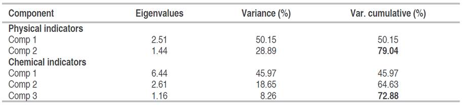 An individual PCA was performed for physical and chemical properties. The selection criterion was PCs with an eigenvalue >1. This was met by the first two and three PCs of the physical and chemical properties, respectively, showing a cumulative variance percentage of 79.04 and 72.88%, respectively, as can be seen in Table 4.