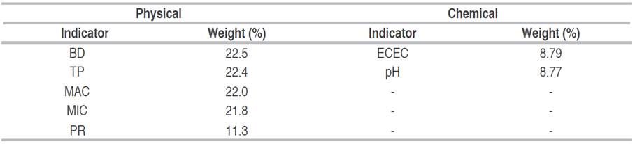 The indicators with the greatest magnitude within each group (BD and ECEC) were selected for the MDS. When these presented the same value, the one with the highest communality was chosen. A high communality indicates that a large part of the variance is explained by said component. Nevertheless, because they explain more than 79% of the variance in the physical variables, TP, MAC and MIC were also selected. In addition, pH was selected because it explains more than 72% of the variance in the chemical indicators (Table 4).