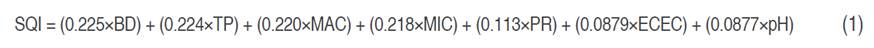 The data in the MDS were re-evaluated by PCA to obtain vector magnitudes for all the soil components. These values were used to calculate the weights of the different soil quality indicators. As a result (Table 6), a soil quality index (SQI) was obtained (Equation 1). The weight of the indicators ranged between 8.7 and 22.5%, while the variables BD, TP, and MAC contributed the most to the model, with 22.5, 22.4, and 22.0%, respectively.