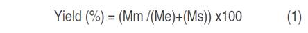 Where: "Mm" microencapsulated = Mass obtained in the encapsulation, "Me" encapsulant = Mass of the encapsulating agent "Ms" total solids = Mass of the total solids content of the propolis essential oil.