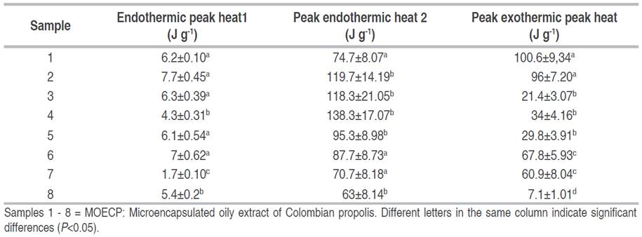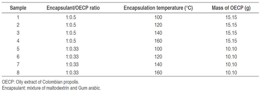 Table 1 lists the parameters used to describe the microencapsulation process using the Spray Dryer. Eight mixtures, two extract/encapsulant ratios, four temperatures, and two amounts of oily Colombian propolis extract (OECP) were used.