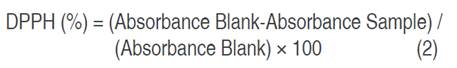 The DPPH method was used to obtain antiradical activity. A mixture of 0.0079 g of DPPH (Sigma Aldrich®) in 2.5 mL of ethanol was prepared and stirred in an amber bottle for 5 min at room temperature. Subsequently, 250 µL of this solution were diluted in 50 mL of 80% ethanol. Next, 300 µL of this mixture were used for a reading at 540 nm in a SpectraMax® 190 Microplate Reader to verify absorbance ranges between 0.5 and 0.6. Finally, 290 µL of the DPPH solution were mixed with 10 µL of diluted OECP or MOECP, respectively. The plate was left in the dark for 30 min, and the sample was read at 540 nm following the method proposed by Ramadan et al. (2012). The antiradical potential was obtained using Equation 2: