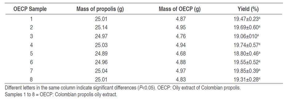 Table 2: OECP yields obtained from the propolis collected during the study.