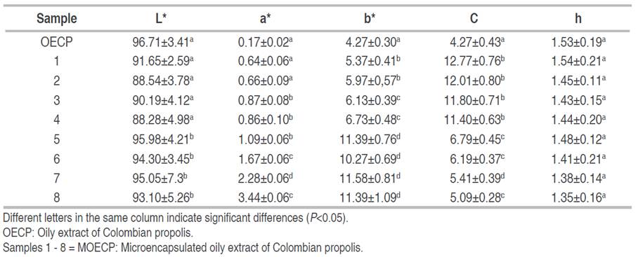 The results of the colorimetry analysis for MOECP are presented in Table 4. The samples had a similar tone (h), without differences (P>0.05), but varied in terms of chroma (C) (P<0.05). This result was due to changes in luminosity and the blue-yellow ratio when the OECP concentration and temperature changed. As the temperature decreased and the concentration of the encapsulating material increased, the intensity of yellow in the samples increased, and the microencapsulation became less luminous. In the eight formulations, there was a significant difference between to the amount of OECP used and the temperature.