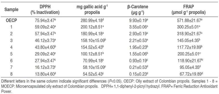 Los extractos oleosos de propóleos se han caracterizado por ser matrices con un alto poder antirradical, reductor y antimicrobiano. Sin embargo, debido a su susceptibilidad a los agentes oxidantes (Oxigeno y luz) que reaccionan con el medio ambiente y afectan negativamente su bioactividad y propiedades sensoriales han limitado su uso. Para preservar la protección de los principios activos y permitir la liberación controlada de sus componentes bioactivos, se evaluó la microencapsulación de extracto oleoso de propóleos proveniente del bosque húmedo premontano colombiano (EOPC) por medio de secado por aspersión (Spray Drying). Para tal fin fueron utilizados como materiales de pared maltodextrina y goma arábiga. Los EOPC microencapsulados (EOPCM) fueron analizados mediante análisis fisicoquímicos y microbiológicos. Los resultados indican que los EOPCM presentaron un alto potencial antioxidante, antiradical y antimicrobiano y las formulaciones con mayor concentración de EOPC y menor temperatura de secado tuvieron mayor bioactividad debido a una menor degradación de metabolitos y a la menor producción de sustancias pro-oxidantes. Se concluye que es posible elaborar EOPCM usando mezclas de maltodextrina y goma arábiga y se conserva más del 50% de los fenoles y carotenoides en la muestra del EOPC.
