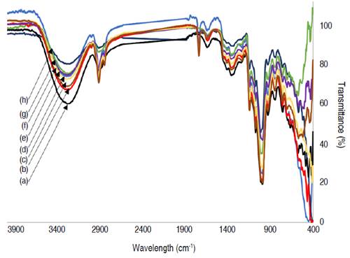 Figure 1: FT-IR spectra of MOECPs. (a) Sample 1 (100 °C), (b) Sample 2 (120 °C), (c) Sample 3 (140 °C), (d) Sample 4 (160 °C), (e) Sample 5 (100 °C), (f) Sample 6 (120 °C), (g) Sample 7 (140 °C), (h) Sample 8 (160 °C). MOECP: Microencapsulated oily extract of Colombian propolis.