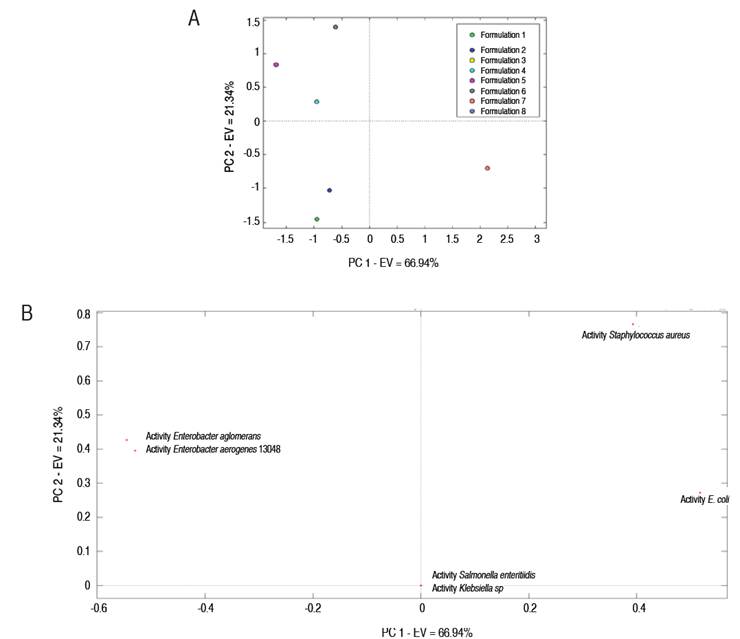 One of the most important factors was a clear differentiation of samples according to their biological activity. Only formulations 1 and 2 shared similarities in terms of their bioactivity. Additionally, MOECP activity against Staphylococcus aureus and Escherichia coli differentiated the samples analyzed better. The activity against microorganisms of the genera Enterobacter, Klebsiella sp., and Salmonella was similar among the eight formulations, indicating that the drying conditions did not affect the activity against these pathogens. There were only two variables that effectively differentiated the samples, and the multivariate protocol allowed the samples to be differentiated.