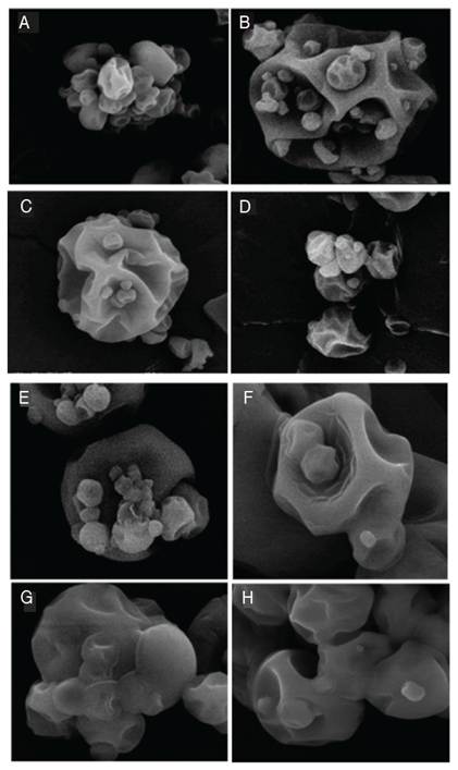 Figure 3: MOECP microparticles at 10 µm magnification. A) Sample 1 (100 °C), B) Sample 2 (120 °C), C) Sample 3 (140 °C), D) Sample 4 (160 °C), E) Sample 5 (100 °C), F) Sample 6 (120 °C), G) Sample 7 (140 °C), H) Sample 8 (160 °C). MOECP: Microencapsulated oily extract of Colombian propolis.