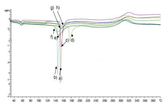Figure 4: DSC spectra of the MOECPs. a) Light Blue: Sample 1 (100 °C), b) Brown: Sample 2 (120 °C), c) Purple: Sample 3 (140 °C), d) Light Green: Sample 4 (160 °C), e) Yellow Ochre: Sample 5 (100 °C), f) Black: Sample 6 (120 °C), g) Dark Green: Sample 7 (140 °C), h) Dark Blue: Sample 8 (160 °C). MOECP: Microencapsulated oily extract of Colombian propolis.