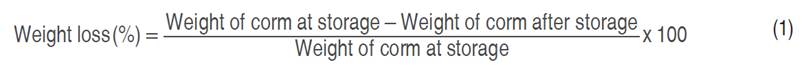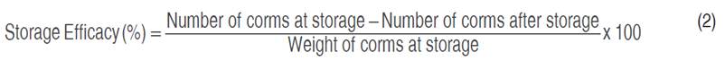 Data were collected on corm weight loss in storage after three months of storage by measuring the corm weight before and after storage for each storage condition and expressing the result in percentages (Equation 1). The storage efficiency was calculated by determining the percentages of the good corms after storage (Equation 2). The storage loss and storage efficiency were determined after three months (January - April 2019) in storage.