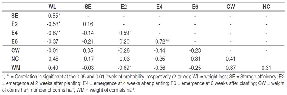 The Pearson correlation coefficient indicated a significant (P<0.05) positive relationship between weight loss and storage efficiency (Table 4). However, a significant (P<0.05) negative correlation coefficient was observed between weight loss in storage and corm emergence at 2 and 4 WAP. Although the weight loss also had a negative correlation coefficient with corm weight and number of cormels ha-1, the relationship was not significant (P<0.05). The correlation coefficient indicated a significant (P<0.05) negative relationship between corm emergence at 2 WAP and the weight of cormel produced at harvest. The variation could be due to the lower rate of moisture loss in the taro compared to tannia in storage. Storage efficiency improved with a reduction in the moisture content of the stored produce (Sugri et al. 2017).