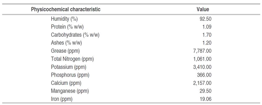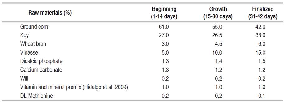 The amount of vinasse in the formulation is increased as the bird grows. The main physicochemical characteristics of this ingredient being those presented in Table 2. The amount of nutrients such as nitrogen, potassium, phosphorus, calcium, iron, and manganese, which are required in broiler feed for its proper development, stand out in the composition of the vinasse used in the study (Vásquez 2018).