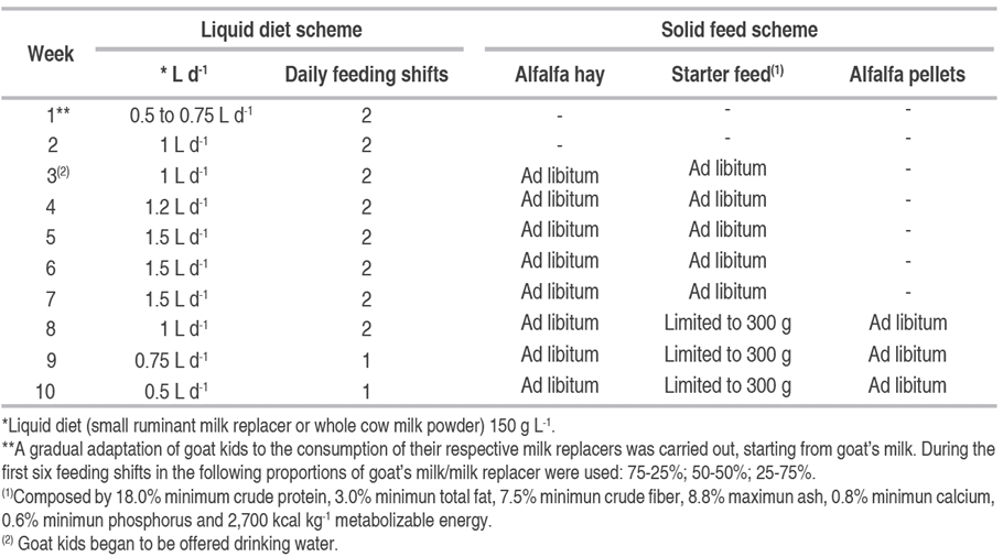 Twenty Anglo-Nubian female goat kids were used. At birth, they were separated from their dams, identified with ear tags and weighted. During their first 48 hours, they were fed colostrum obtained by hand milking and administered through nursing bottles.