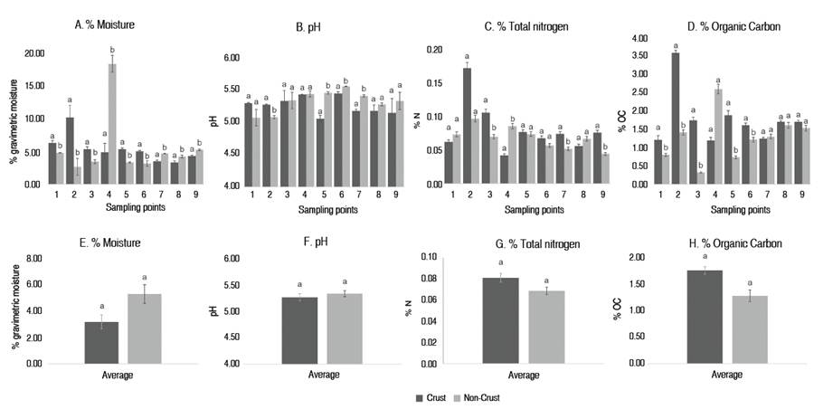 Figure 2: Results of the physicochemical variables by sampling points and average (from 1 to 9). In graphs A, B, C, and D, soils with and without crust are compared individually, while graphs E, F, G, and H show comparisons with the average of soils with and without crust. Significant differences are indicated above the bars with letters a-b when there is a significant difference and a-a when there is not, using a P>0.05.