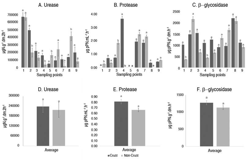 Figure 3: Results of the enzymatic activity variables by sampling points (1 to 9) and average. In graphs A, B, and C, soils with and without crust are compared individually, while graphs D, E, and F show comparisons with the average of soils with and without crust. Significant differences are indicated above the bars with letters a-b when a significant difference is present and a-a when there is no significant difference, using P>0.05.