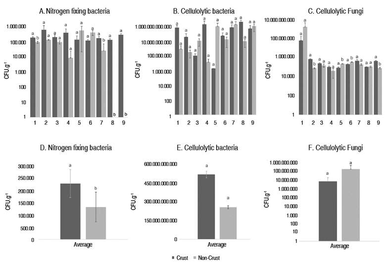 Figure 4: Results of the enumeration of microorganisms associated with carbon and nitrogen cycles by sampling points (from 1 to 9) and the average. In graphs A, B, and C, soils with and without crust are compared individually, while graphs D, E, and F are compared with the average of soils with and without crust. Significant differences are indicated above the bars with letters a-b when there is a significant difference and a-a when there is not, using a P>0.05.