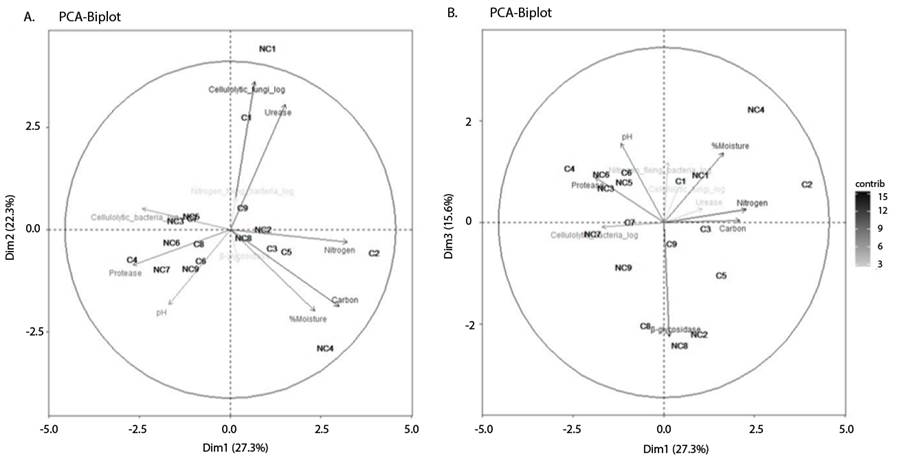 Figure 5: Principal Component Analysis (PCA). The letters C and NC denote soil samples with and without crust, respectively. The numbers preceding C and NC refer to the sampling points. Graph A displays the analysis of Axes 1 and 2, while Graph B shows the analysis of Axes 1 and 3.