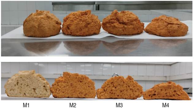 Figure 1: Scones samples. M1: control sample; M2: sample with 20% of CT, 25% margarine reduction; M3: sample with 25% of CT, 35% margarine reduction; M4: sample with 30% of CT, 50% margarine reduction.