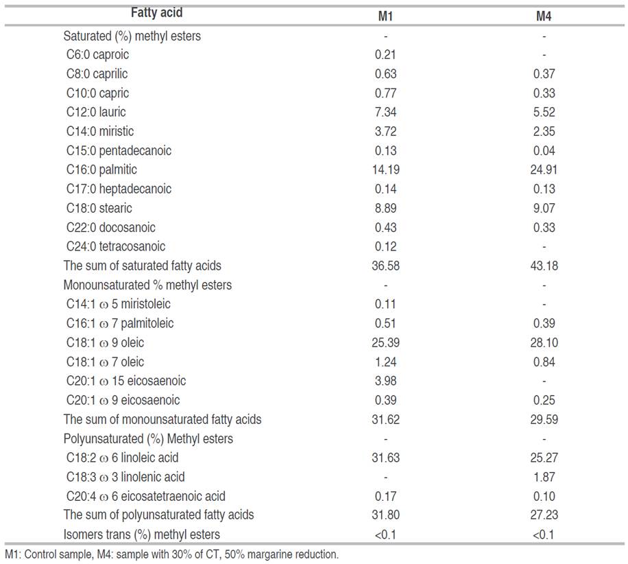 As shown in Table 2, the protein and ash content do not exhibit statistically significant differences between the analyzed samples. In contrast, the fat content was significantly higher (P<0.05) in the control sample and demonstrated a reduction with increasing CT incorporation. The carbohydrate content was significantly higher (P<0.05) in sample M1. Statistically significant differences (P<0.05) were observed in the total dietary fiber (TDF) content, with M1 displaying the lowest value and M4 the highest. A similar trend was observed for soluble dietary fiber (SDF) and insoluble dietary fiber (IDF). The caloric intake is significantly higher in M1 and significantly lower in M4 (P<0.05).