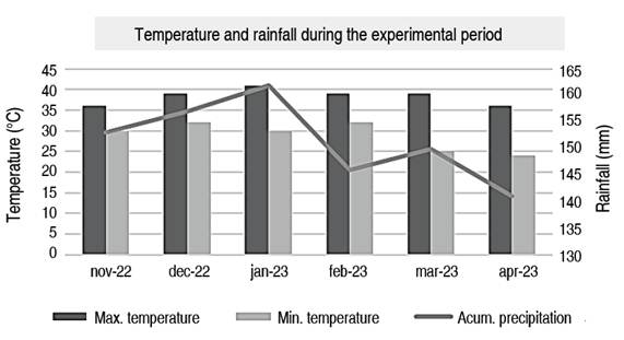 Figure 1: Monthly precipitation and maximum and minimum temperatures during the experimental period (DINAC 2023).