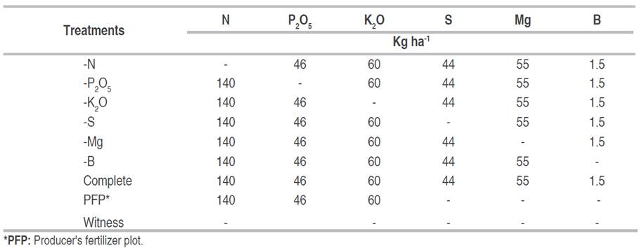 The study factor was the omission of nutrients to the progenitors, for this purpose six omission treatments (N, P, K, Mg, S and B), a complete fertilization treatment one based on fertilization by a farmer and an absolute control were evaluated (Table 1), the area of each experimental unit was 24 m2, with a useful area of 9.6 m2.
