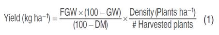 The yield (kg ha-1) was determined using Equation 1, with data on fresh harvested grain weight (FGW), and the percentage of grain moisture (GW) in the fertilized female plants of each treatment and the result was adjusted to 14% desired moisture (DM).
