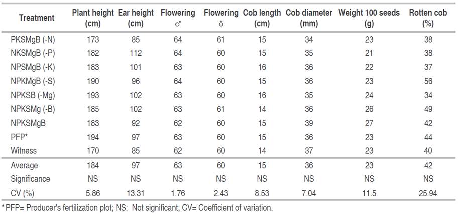 The percentage of rotten cobs did not show differences; however, the highest values were observed with the S omission treatment (56%) and the lowest value with the Mg omission treatment (49%).