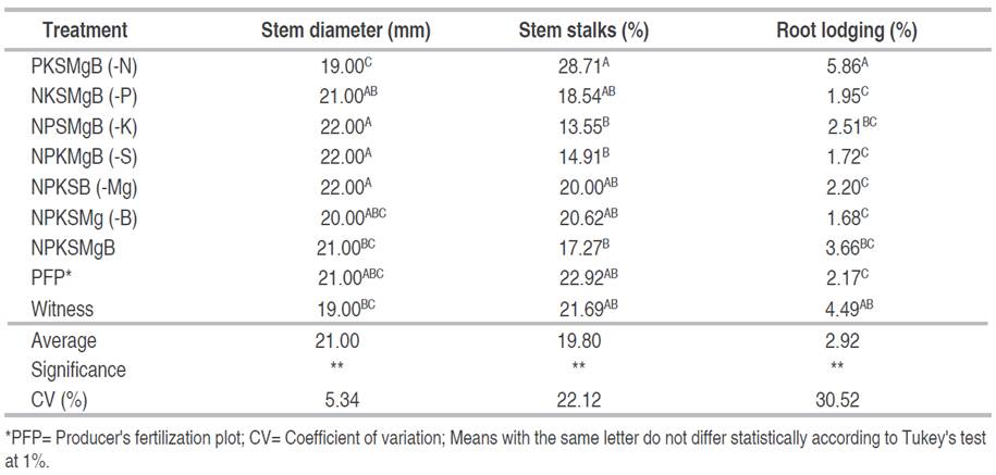 The variables stem diameter, stem lodging and root, presented highly significant statistical differences (P<0.05) (Table 3). The greatest stem diameter reduction was found with the N omission treatment (19 mm); however, the omission of Mg obtained the greatest diameter (22 mm), these values are similar to those reported by Remache et al. (2017), indicating that with N omission a stem diameter of 17 mm was obtained.