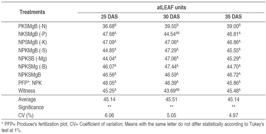 Table 4 shows the chlorophyll levels at 25, 30 and 35 DAS, highly significant differences were found, registering the lowest values in the omission of N (36.68, 39.55 and 39 atLEAF units), respectively. These findings align with Ontiveros-Capurata et al. (2022), stated, that atLEAF meters can be used to estimate N levels in plants in a non-destructive, fast and reliable way. The observed reduction in chlorophyll content due to N omission is consistent with Toor et al. (2021), who state that N is an important component of chlorophyll, proteins, nucleic acids and other plant components. These findings underscore this importance and highlight the need to consider nitrogen as a key element in plant nutrition.