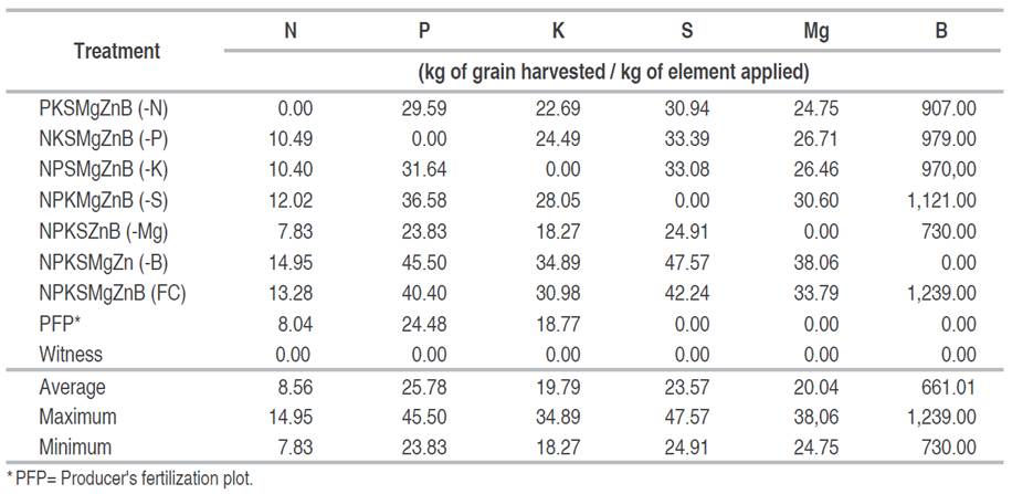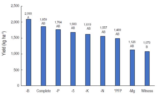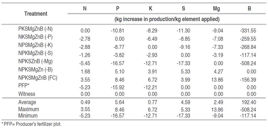 For B, the efficiencies were negative for all the omitted elements. The lowest decrease was observed with the S omission treatment with values of -117.14 kg kg-1 and a reduction in efficiency was observed with the omission of Mg with -508.24 kg kg-1. These values do not coincide with those obtained by Hasang et al. (2018) who reported that with the omission of N there was a reduction of 300 kg kg-1 of B.