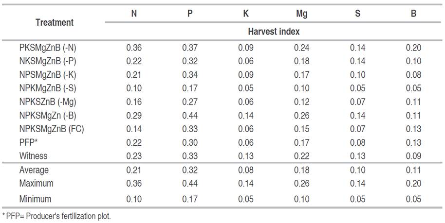 In the partial factor of N productivity, the highest effect was found with the omission of B (14.95 kg kg-1) and the lowest with the omission of Mg (7.95 kg kg-1), which means that for each kg of B, the yield decreases by 11.17% the PPF of N in relation to the FC treatment. For P, the PPF, with the omission of B was achieved 45.50 kg kg-1 P, indicating that the effect of the application of the element, reduces by 11.02% the PPF of P, in relation to the FC treatment. The application of Mg caused an increase in P PPF of 41.03%. The PPF of K was found that, with the omission of B, the highest PPF was achieved (34.89 kg kg-1 of K), indicating a reduction of 12.62% of harvested grain per kg of K applied with the addition of B, in relation to the FC. The lowest FPP of K resulted from the omission of Mg (18.27 kg kg-1), being that with its application there is an increase in FPP of K of 41.02%, these results coincide with the reported by Hasang et al. (2018). For S, the PPF, the omission of B with 47.57 kg kg-1 of S applied, resulted in the highest PPF value; this implies that with the application of B the PPF of S will be reduced by 42.02%, as a function of FC.