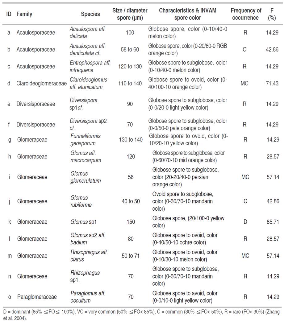 Table 2: Occurrence frequency and global frequency (F%) of arbuscular mycorrhizal fungus species in soil around of trees of Tamarindus indica trees in the municipality of Sopetrán.