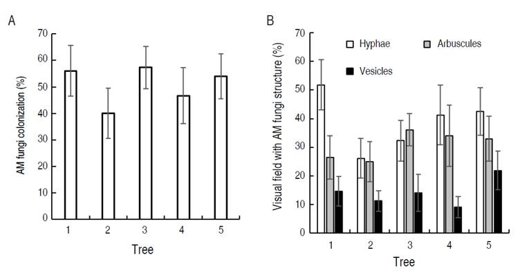 The percentage of colonization was determined in samples taken from five trees, through the microscope slide intersection method, using one slide per sample (McGonigle et al. 1990). In this method, roots were aligned parallel to the long axis of the slide and observed at 200x magnification. The number of intersections was examined by counting arbuscules, vesicles and hyphae. This procedure was repeated in 12 visual fields of root simples from each tree.