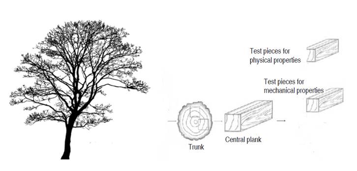 The logs were sawn and dimensioned for the extraction of samples or wooden specimens that after an airdrying process were measured and tested to technologically characterize the species under study. The test pieces were elaborated following the methodology proposed by the American Society for Testing and Materials (ASTM 2003) and the Colombian technical standards (NTC), which establish the procedures both in specifications of the test pieces, test speed and number of samples to be tested.