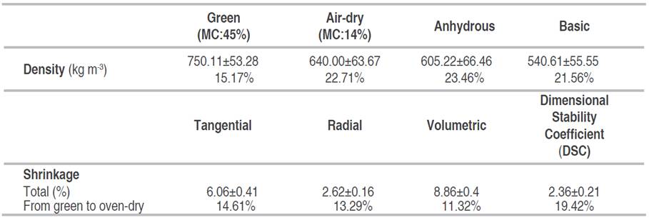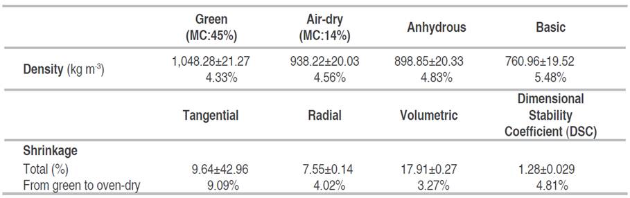 According to the basic density classification of the NTC 2500 (Civil Engineering and Architecture. Using Wood for Construction), the wood of Brosimun lactescens species belongs to Group A, making it useful for construction with 760.96 kg m-3 (greater than 710 kg m-3). These results are equal to those obtained by Rosales-Solórzano et al. (2018) in studies made for the same wood. Still, they are higher than those found for the wood of Brosimun alicastrum species, which has medium density and belongs to the Group B category used for construction purposes (Escobar and Rodríguez 1993).