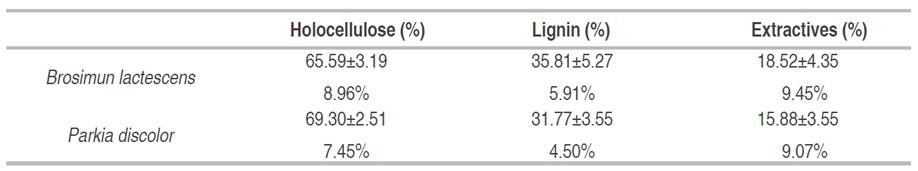 Table 5: Results for the chemical composition of the woods of Brosimun lactescens and Parkia discolor species.