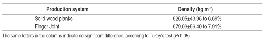Table 1: Air-dry density of (CLT) panels made with Pinus tecunumanii wood and produced with solid wood planks and Finger Joint systems.