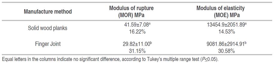 Table 3: Mechanical resistance to static bending of the CLT panels from Pinus tecunumanii wood manufactured with solid wood planks and Finger-Joint methods.