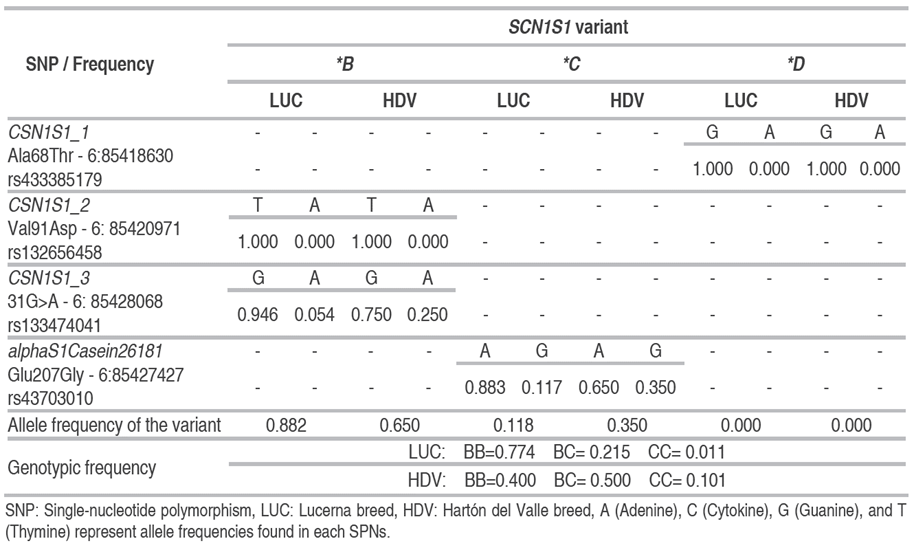 Ten variants (*A, *B, *C, *D, *E, *F, *G, *H, *I and *J ) are recognized in the α S1 -CN protein (Meier et al. 2019), from which only three (*B, *C and *D) can be reconstructed with the SNPs present in the GeneSeek® Genomic Profiler™ Bovine 150 K chip, despite the highly polymorphic nature of the gene (Ahmed et al. 2017), but this is explained by the breeds used to develop the chip. The CSN1S1*B allele is reported to be the most frequent in several Bos taurus breeds, including Angler (1.0), Eringer (0.77), German Red Pied (0.93), German Yellow (1.0), Highland Cattle (1.0), Hinterwälder (0.93), Hungarian Grey Steppe (0.73), Jersey (0.68), Limpurger (1.0), Pinzgauer (0.74), Sarabi (0.54), Shorthorn (1.0) and Vorderwälder (0.87) (Gallinat et al. 2013). In the Holstein breed, the frequency of this allele is reported to be higher than 0.95 (Ardicli et al. 2018; Meier et al. 2019) and in the Simmental breed, 0.90 (Čítek et al. 2023). In the Colombian creole breed Blanco Orejinegro (BON), the frequency of the *B allele reached 0.80 (Hernández-Herrera et al. 2024). On the other hand, in Bos indicus breeds, the CSN1S1*C allele is the most common (Butana=0.66, Gir=0.50, Golpayegani=0.48, and Sistani=0.88) (Gallinat et al. 2013).