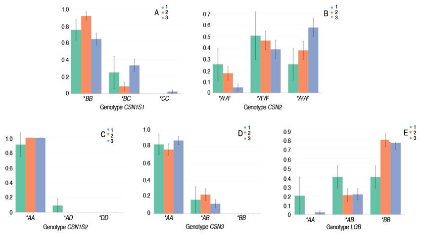 Figure 2: Genotypic frequencies of CSN1S1 (A), CSN2 (B), CSN1S2 (C), CSN3 (D), and LGB (E) genes by generation (generation 1: cattle born before 2010; generation 2: animals born between 2010 and 2015; generation 3: individuals born between 2016 and 2021) in the Lucerna breed.