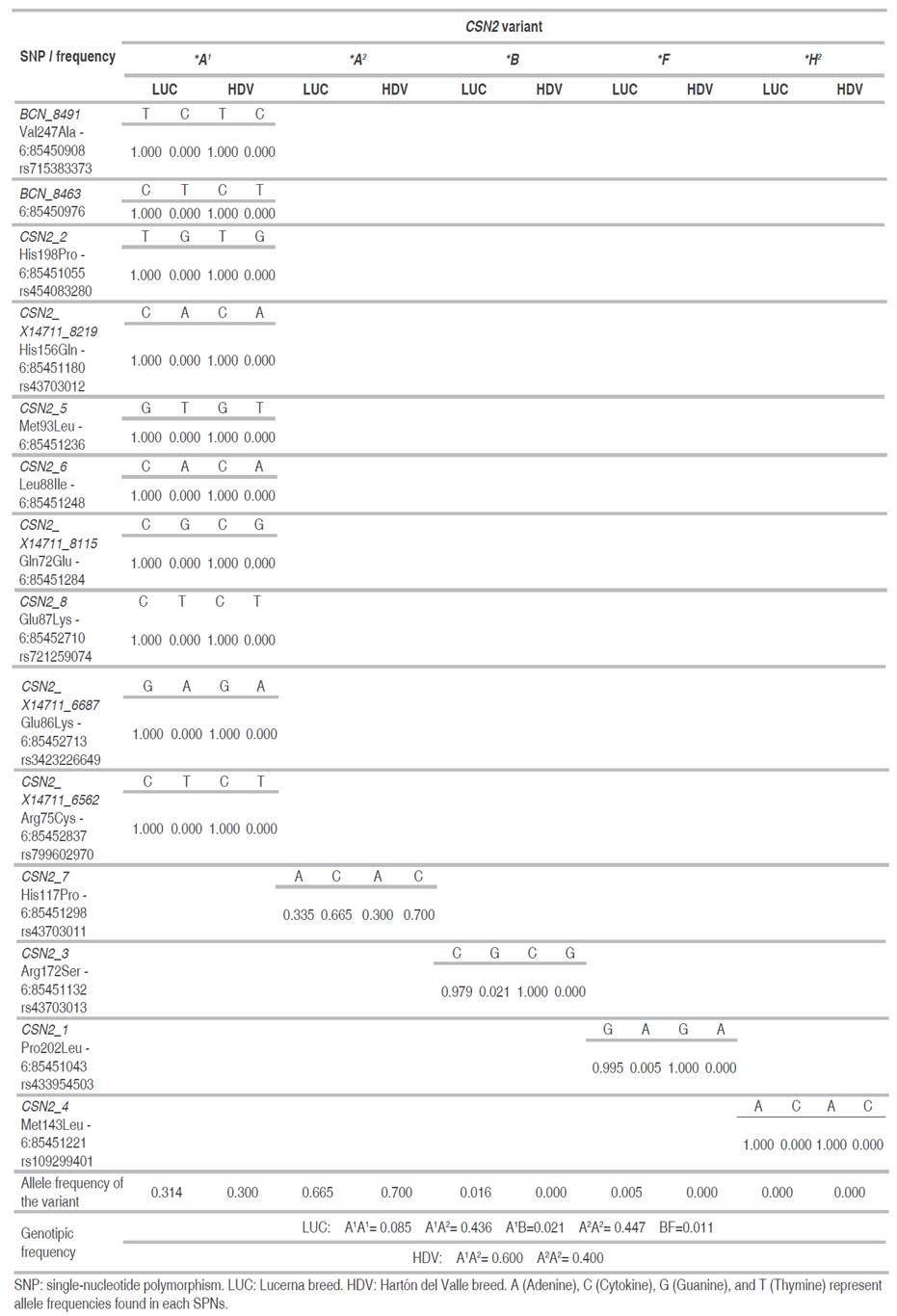 El objetivo de esta investigación fue evaluar la variación en los genes CSN1S1, CSN2, CSN1S2, CSN3 y BLG en la raza Lucerna (LUC). Para ello, 94 animales LUC y 10 animales Hartón del Valle (HDV) fueron genotipados usando el chip GGP™ Bovine 150 K, que tiene cuatro SNPs en el gen CSN1S1, 14 en el gen CSN2, dos en el gen CSN1S2, 12 en el gen CSN3 y 11 en el gen LGB. A partir de los cuales fueron reconstruidos los haplotipos y variantes proteínicas de la α S1 -CN, β-CN, α S2 -CN, κ-CN y β-LG. Se compararon las frecuencias genotípicas de las variantes más importantes entre sexos y generaciones. Se evaluó el equilibrio de Hardy-Weinberg y los valores de wF ST y F IS para cada uno de los SNPs. Se estimaron y graficaron los valores de LD y las frecuencias haplotípicas para las caseínas. Las variantes CSN1S1*B, CSN2*A 2 , CSN1S2*A, CSN3*A y BLG*B fueron las más frecuentes en ambas razas. Las frecuencias genotípicas no variaron entre sexos, y solo el genotipo CSN2*A 2 A 2 varió entre generaciones. Todos los marcadores mostraron equilibrio de Hardy-Weinberg, excepto un SNP en el gen BLG. Los valores de wF ST obtenidos fueron muy bajos por el sexo (wF ST =0,0043) y generación (wF ST =0,026). Mientras que, el valor de F IT fue de -0,0086. Se encontraron 19 haplotipos CSN1S1-CSN2-CSN1S2-CSN3 en LUC y ocho en HDV con frecuencias diferentes. El ligamiento genético fue bajo entre los genes de las caseínas. En conclusión, los genes evaluados son polimórficos y con alta frecuencia de las variantes relacionadas con mayor producción mejor calidad y rendimiento tecnológico de la leche. Estos resultados pueden ser utilizados en programas de selección asistida destinados a mejorar la calidad de la leche y los rasgos de procesado.