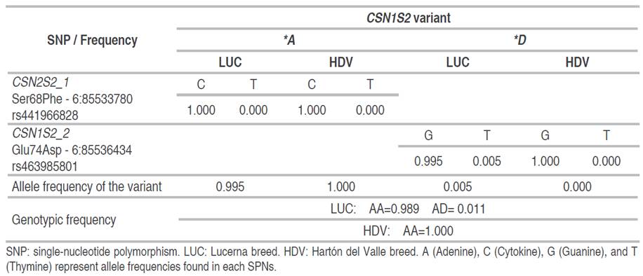 Five variants are known in the α S2 -CN protein, including *A, *B, *C, *D, and *E (Meier et al. 2019). However, the genotyping chip only has two SNPs (rs441966828 and rs463985801) in the CSN1S2 gene that allow analysis of the *A and *D variants. In the HDV breed, the SNPs were monomorphic and only the SNP CSN1S2_2 varied in LUC (Table 3); therefore, the reference variant CSN1S2*A and the *AA genotype were fixed in HDV and with a very high frequency in LUC.