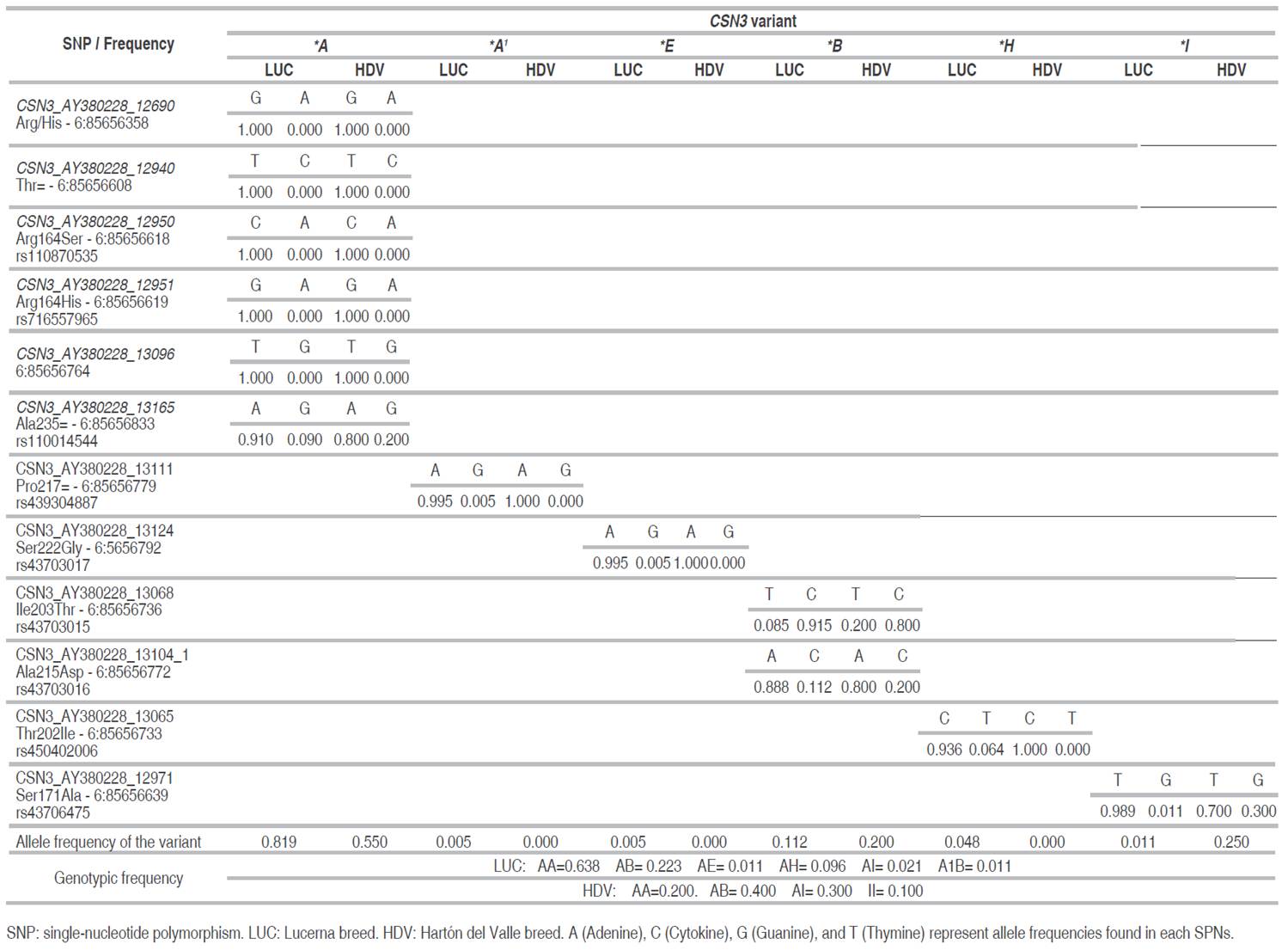 Table 2: Allele frequencies of SNPs located in the CSN2 gene and allele and genotypic frequencies of protein variants in the β-CN in the breeds studied.