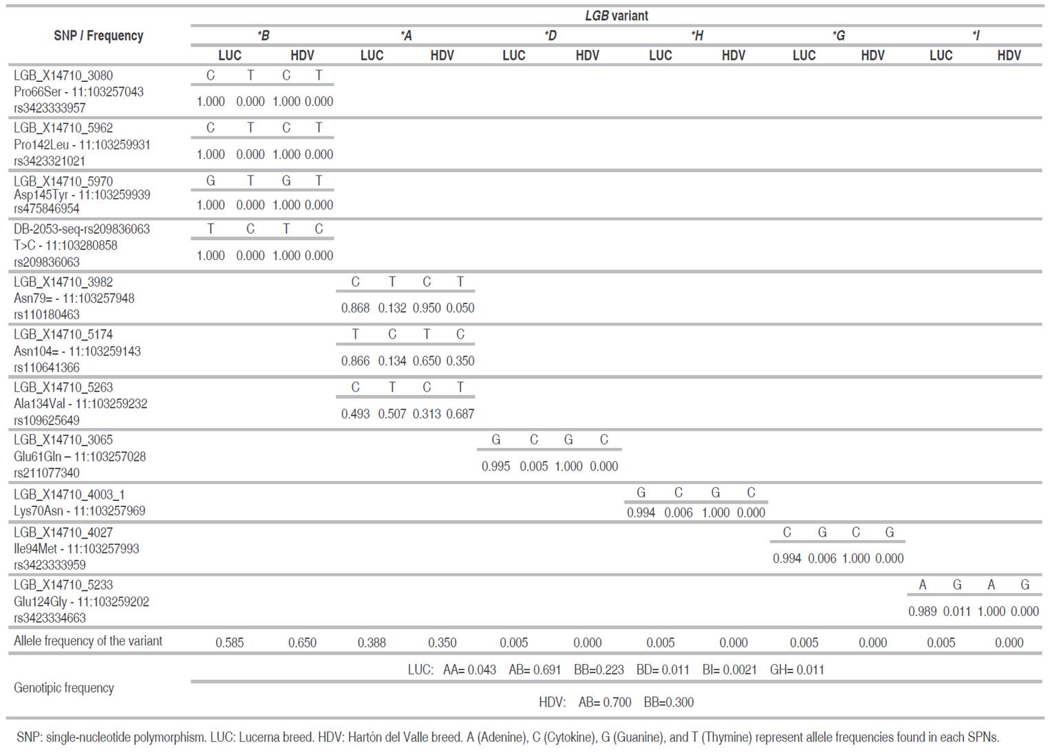 The frequency found for the *A allele in the LUC breed is higher than what was reported in many breeds around the world, including Angler (0.55), Butana (0.47), Eringer (0.50), German Red Pied (0.71), German Yellow (0.45), Gir (0.07), Hinterwälder (0.75), Holstein (0.52), Hungarian Grey Steppe (0.55), Jersey (0. 42), Karan Fries (0.62), Limpurger (0.80), Pinzgauer (0.59), Retinta (0.13), Sarabi (0.30), Shorthorn (0.60), Sistani (0.28) and Vorderwälder (0.78) (Gallinat et al. 2013; Ahmed et al. 2017; Meier et al. 2019; Chessa et al. 2020; Mohan et al. 2021); only slightly surpassed by Black Pied (0.83) (Meier et al. 2019). This gene has been studied in other breeds in Colombia. The frequency of the Κ-CN*A variant has been reported as 0.68 in the BON breed (Hernández-Herrera et al. 2024), 0.68 in the HDV breed (Naranjo et al. 2007), and 0.80 in the Holstein breed (Padilla-Doval et al. 2021). In contrast, the Κ-CN*B variant is reported at a high frequency in the Jersey breed (0.9) (Chessa et al. 2020), while the Κ-CN*H variant is more common in B. indicus breeds such as Gir (0.5) and Sistani (0.5) (Gallinat et al. 2013).