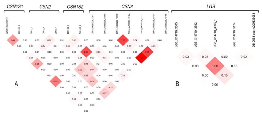 Figure 3: Linkage disequilibrium heat map of SNPs after pruning in the casein (A) and beta-lactoglobulin (B) genes in the Lucerne breed.