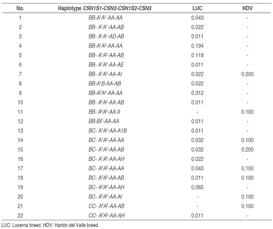 Table 6: Haplotype frequencies of the CSN1S1-CSN2-CSN1S2-CSN3 genes in the Lucerna and Hartón del Valle breeds.