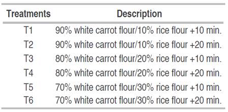 A complete randomized design with factorial arrangement AxB was applied, where factor A: ratio of white carrot flour -rice flour and factor B: dough rest, thus obtaining a total of six treatments with three replicates resulting in 18 experimental units. To determine statistical differences, a Tukey test (P<0.05) was applied using the InfoStat Software. The treatments are detailed in Table 1.