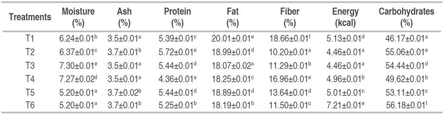 A statistically significant effect (P<0.05) was observed in the percentage of carbohydrates among the evaluated treatments. Treatment T6, with 56.18%, showed a notable increase compared to T3, which registered the lowest percentage with 46.17%, positioning itself as the treatment with the lowest carbohydrate content. This highlights the influence of the treatments on carbohydrate content, underlining the variability observed in each one. On the other hand, in previous research, the incorporation of carrot flour in cookie production values ranging from 52.77 to 63.47% were reported. These values are consistent with those obtained in the present study (Kiin et al. 2021). In addition, carbohydrates play a crucial role in consumer food choice in relation to health. Previous research, such as the study on fig and oat flour-based cookies, highlights the importance of carbohydrates by constituting a significant part (49.79%) of the total product composition (Quelal 2023).