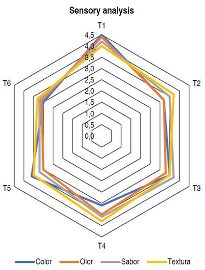 Through the evaluation of the sensory profiles of cookies made from carrot and rice flour (Figure 1), it was determined that T1 (90% carrot flour/10% rice flour +10 min) obtained the best scores for odor 4.4; flavor 4.2 and texture 4.0; while, T6 (70% carrot flour/30% rice flour +20 min) had the lowest scores in the odor and texture profiles 3.7. In general, O'Sullivan (2017) emphasizes that, to achieve success, a product must satisfy the consumer through sensory perceptions. According to the sensory analysis on brown rice-based cookies with moringa (Moringa oleifera) and stevia (Stevia rebaudiana Bertoni) conducted by Almora-Hernández et al. (2023) the cookies received moderate criticism in terms of their texture, specifically in terms of their ability to fracture and their level of crunchiness. Castro García et al. (2024) evaluated the sensory profile of cookies made with brown rice (O. Sativa), carob (Prosopis alba) and pigeon pea (Cajanus cajan), obtaining values of 4.2 color, 3.6 odor, 4.0 flavor, and 4.20 for texture, which are comparable to the results reported in this study. On the other hand, in studies of cookies based on carrot peel in concentrations of 5, 10, and 20%, in which a sensory characterization determined that including 20% in the formulation and preparation was significantly preferable (Quitral et al. 2023).